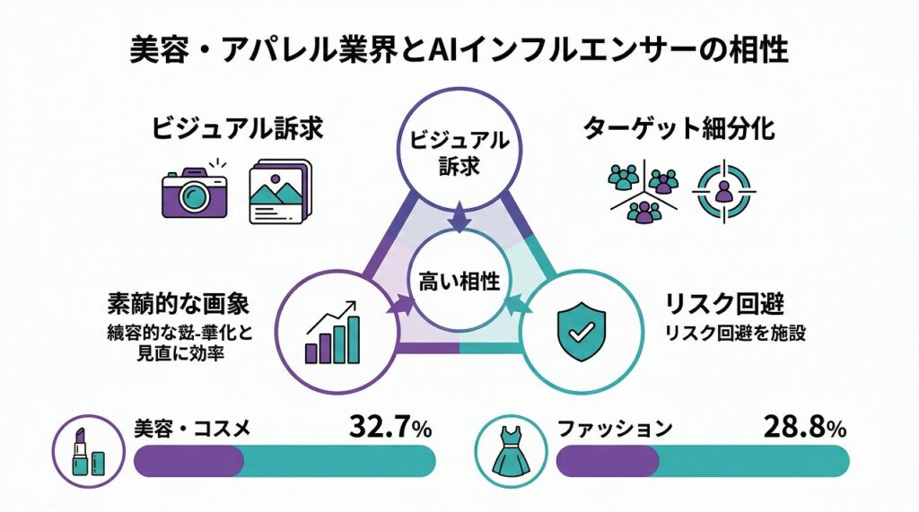 Influencer Marketing Factoryの調査によると、AIインフルエンサーが最も効果を発揮する業界として、美容・コスメ(32.7%)とファッション(28.8%)が上位に挙げられています。この背景には、美容・アパレル業界特有の3つの要因があります。