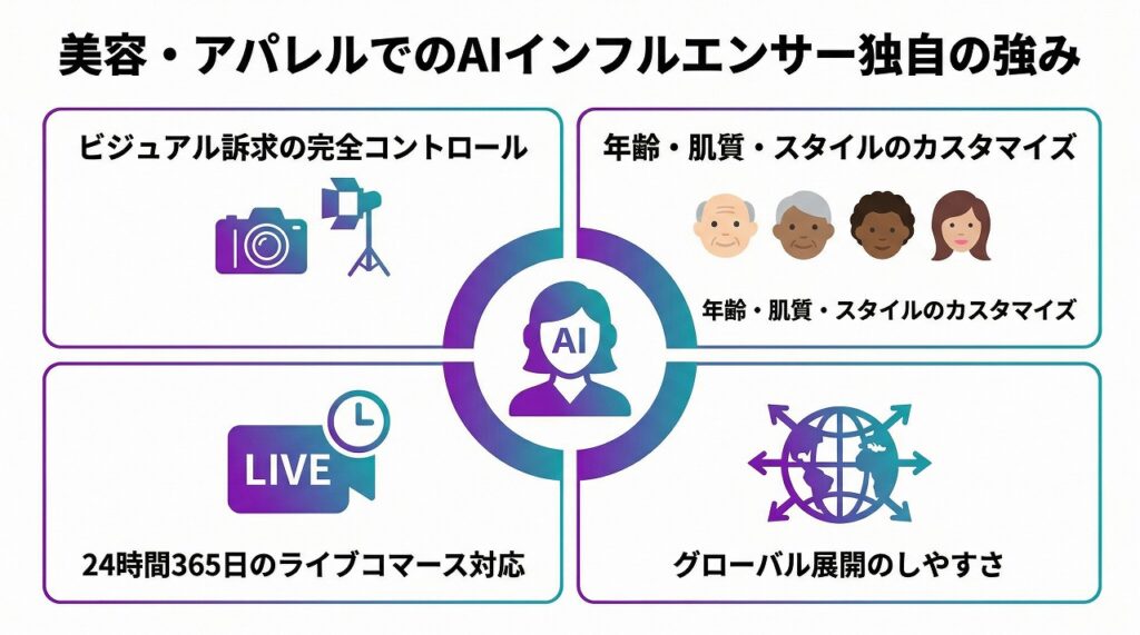 つまり、美容・アパレル業界におけるAIインフルエンサーの強みは「ビジュアル訴求」「ターゲット細分化」「24時間対応」「グローバル展開」の4点に集約されるということ。