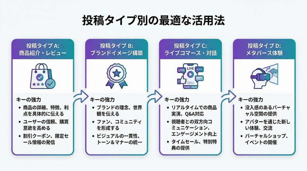 - 投稿タイプ別(商品紹介・ブランドイメージ・ライブコマース)の最適な活用法