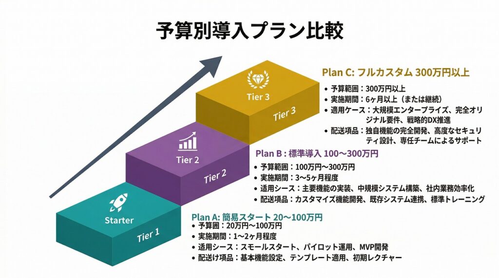 - 予算別の導入プラン(20万円〜1,000万円以上)と、どのレベルから始めるべきか