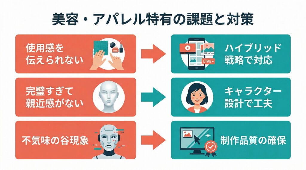 つまり、美容・アパレル特有の課題は「使用感の伝達」「親近感の欠如」「不気味の谷」の3点だが、いずれも「ハイブリッド戦略」「キャラクター設計の工夫」「制作品質の確保」で対策可能ということ。