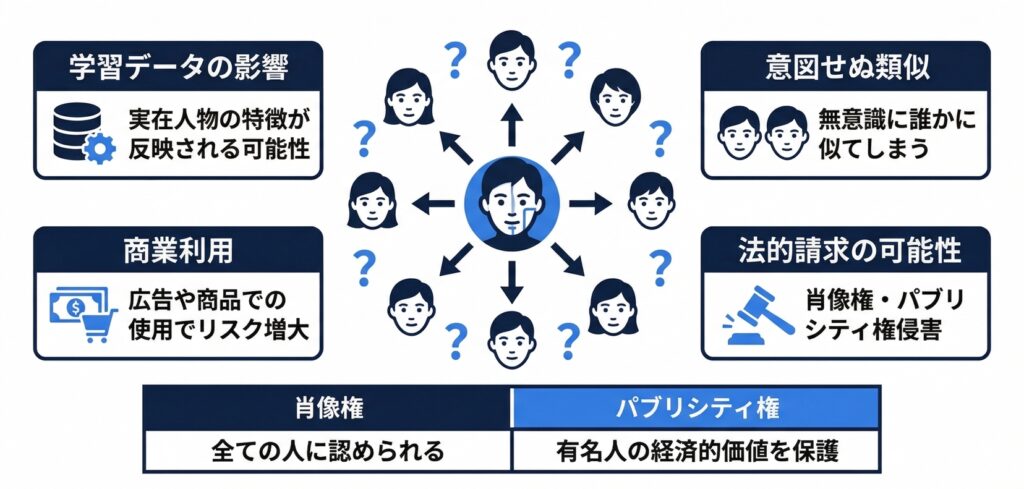 この結果、「意図せず誰かに似てしまった」というリスクが発生します。特に有名人やタレントの場合、肖像権だけでなくパブリシティ権(その人物の顔が持つ経済的価値を無断で利用することへの権利)も問題になります。