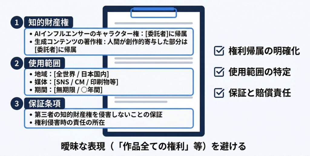 最も重要なのは、AIインフルエンサーのキャラクター権がどこに帰属するかです。「制作会社に帰属する」「委託企業に帰属する」「両者で共有する」のいずれかを明確にします。長期的に自社ブランドの顔として育てるのであれば、キャラクター権は委託企業に帰属させることが原則です。