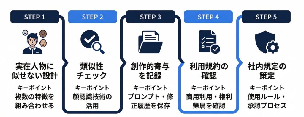 - 企業が取るべき対策は5つ。実在人物に似せない設計、類似性チェック、創作的寄与の記録、利用規約の確認、社内規定の策定を組み合わせる