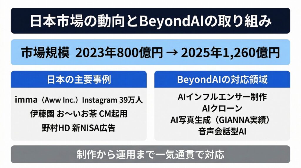 日本市場でもAIインフルエンサーの活用が急速に広がっています。矢野経済研究所の調査によると、日本のVTuber市場は2023年度に800億円、2025年度には1,260億円に成長すると予測されています。