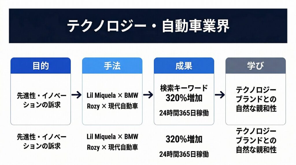 つまり、テクノロジー・自動車業界では「先進性の訴求」と「マルチチャネル展開」にAIインフルエンサーが最適だということ。