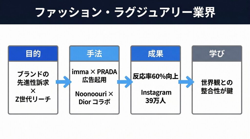 つまり、ファッション・ラグジュアリー業界では「ブランドの先進性訴求」と「リスク管理」の両面でAIインフルエンサーが高い価値を発揮するということ。