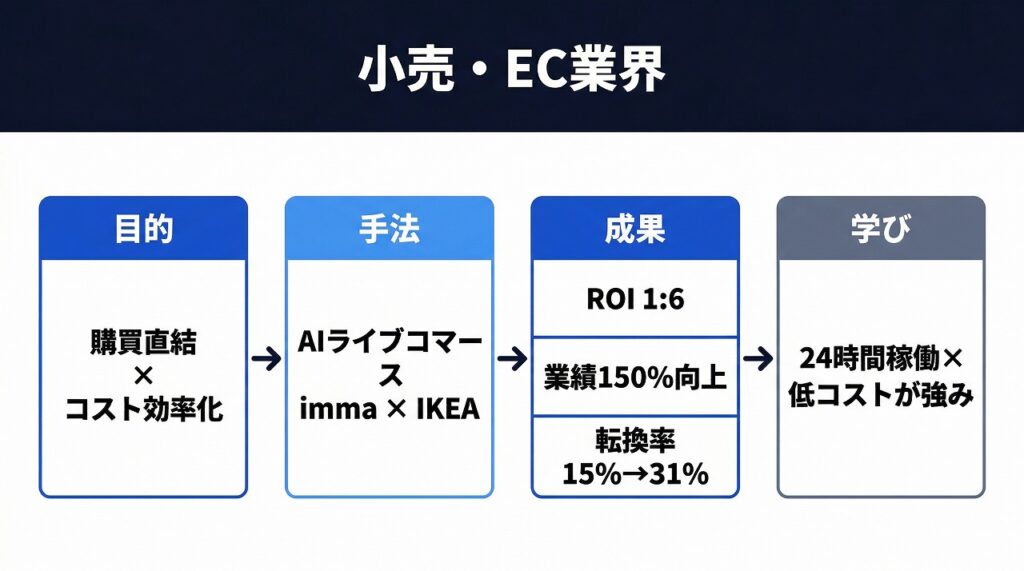 つまり、小売・EC業界では「24時間販売促進」と「ライフスタイル訴求」にAIインフルエンサーが革命的な効果を発揮するということ。