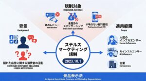2023年10月に施行された景品表示法のステルスマーケティング規制は、AIインフルエンサーにも適用されます。企業からの依頼で商品を紹介する場合、「PR」「広告」などの表記が必要です。