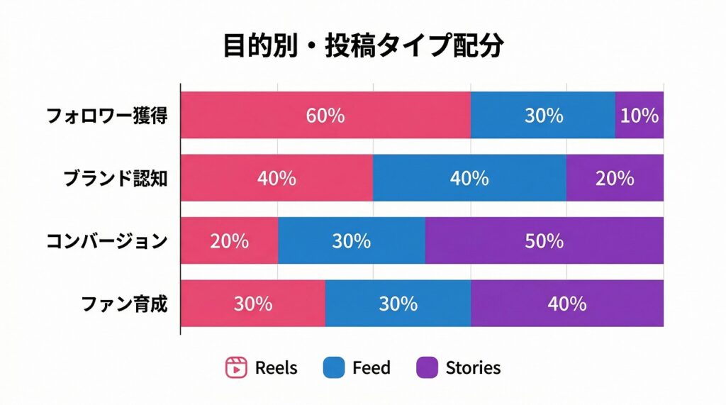 例えば「フォロワー獲得」を目的とする場合、リール60%・フィード30%・ストーリーズ10%という配分から始め、データを見ながら調整します。