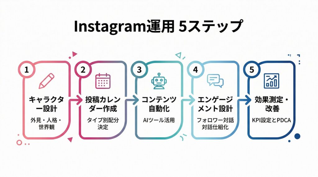 つまり、「キャラクター設計→投稿計画→コンテンツ自動化→エンゲージメント設計→効果測定」の5ステップを確実に回すことが、Instagramでの成果につながるということ。