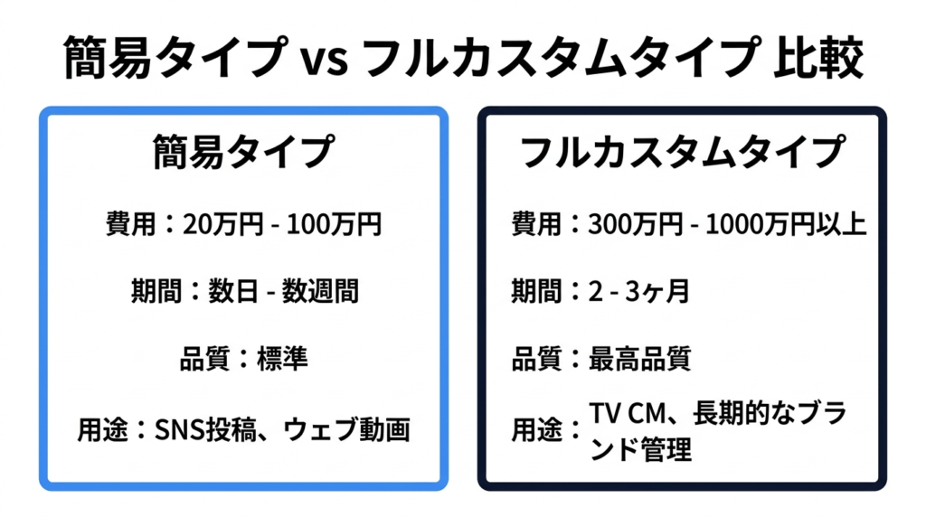 AIインフルエンサーの制作は、大きく「簡易型」と「フルカスタム型」の2パターンに分かれます。簡易型は、既存のAI画像生成ツール(Stable Diffusion、Midjourneyなど)で外見を作成し、音声合成ツールで声を付ける方式です。費用は20万〜100万円程度、制作期間は数日〜数週間で、SNS運用やWeb動画のナレーションなど限定的な用途に向いています。