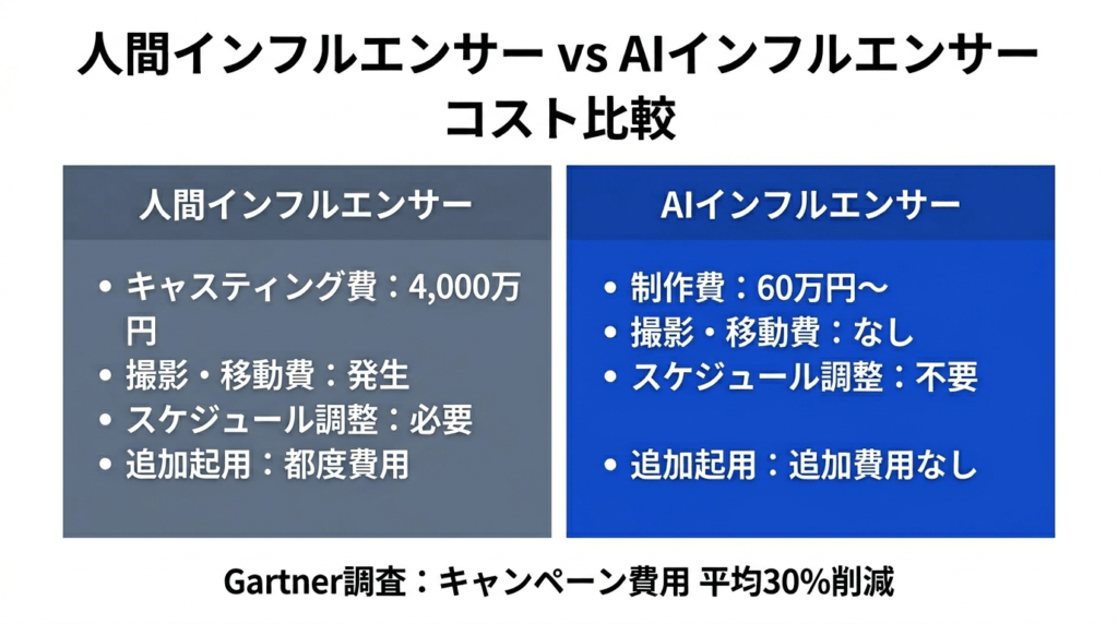 Gartnerの調査によると、人間のインフルエンサーをAIインフルエンサーに置き換えることで、キャンペーン費用を平均30%削減できるとされています。削減の内訳は、出演料・渡航費・スケジュール調整コスト・撮影費用など、人間を起用する際に不可避だったコストです。