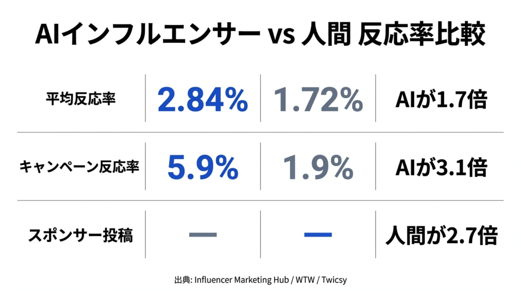 一方で、すべての場面でAIが勝つわけではありません。Twicsyの調査では、スポンサー投稿(企業から報酬を受けたPR投稿)に限ると、人間インフルエンサーがAIの2.7倍の反応を獲得しています。これは消費者が「本音のレビュー」を求めるPR投稿においては、実体験に基づく人間の言葉の方が響くためと考えられます。