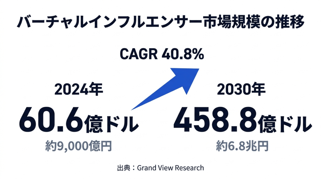 バーチャルインフルエンサー市場は、Grand View Researchの調査によると2024年時点で約60.6億ドル(約9,000億円)に達しています。2030年には458.8億ドル(約6.8兆円)に成長すると予測されており、年平均成長率(CAGR)は40.8%です。