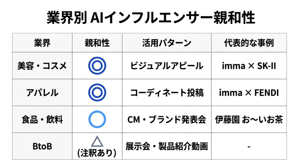 Influencer Marketing Factoryの調査では、AIインフルエンサーが最も効果を発揮する業界として、ゲーム(36%)、テクノロジー(33.5%)、美容・コスメ(32.7%)、ファッション(28.8%)が挙げられています。特に美容・コスメとアパレル・ファッションは、ビジュアルの完成度がそのまま訴求力に直結するため、AIインフルエンサーとの相性が極めて高い業界です。