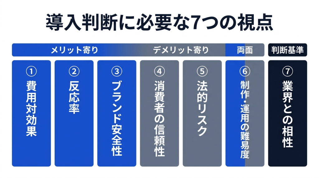 - AIインフルエンサーの導入判断に必要な視点は「費用対効果」「反応率」「ブランド安全性」「消費者信頼性」「法的リスク」「制作・運用難易度」「業界相性」の7つ