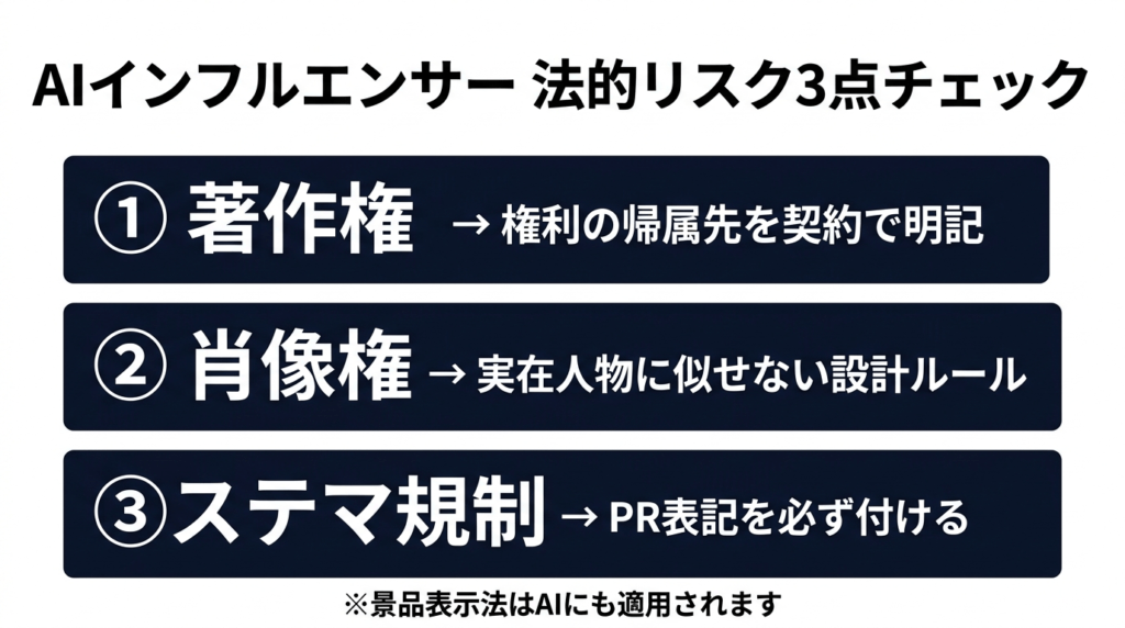 2023年10月に施行された景品表示法の「ステルスマーケティング規制」は、AIインフルエンサーにも当然適用されます。AIインフルエンサーが企業の依頼で商品を紹介する場合、「PR」「広告」などの表記が必要です。「AIだからステマ規制の対象外」ということはありません。