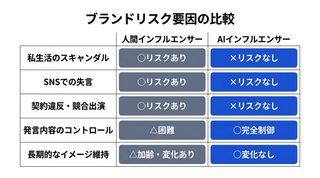 つまり、人間インフルエンサー最大のリスクである「不祥事・失言」がゼロになることは、特にブランド毀損を恐れる法人にとって決定的なメリットだということ。