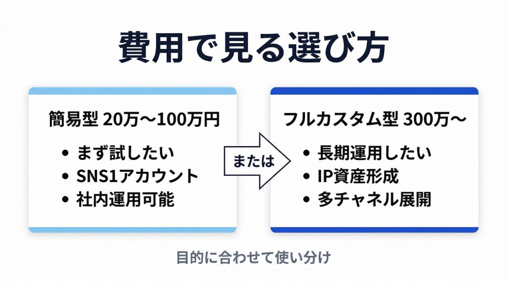 | 向いている目的 | 短期キャンペーン・認知拡大 | 長期ブランド構築・IP資産形成 |