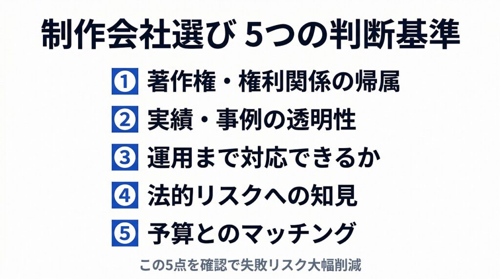 - 5つの判断基準:著作権帰属・実績透明性・運用対応力・法的知見・予算マッチングを確認する