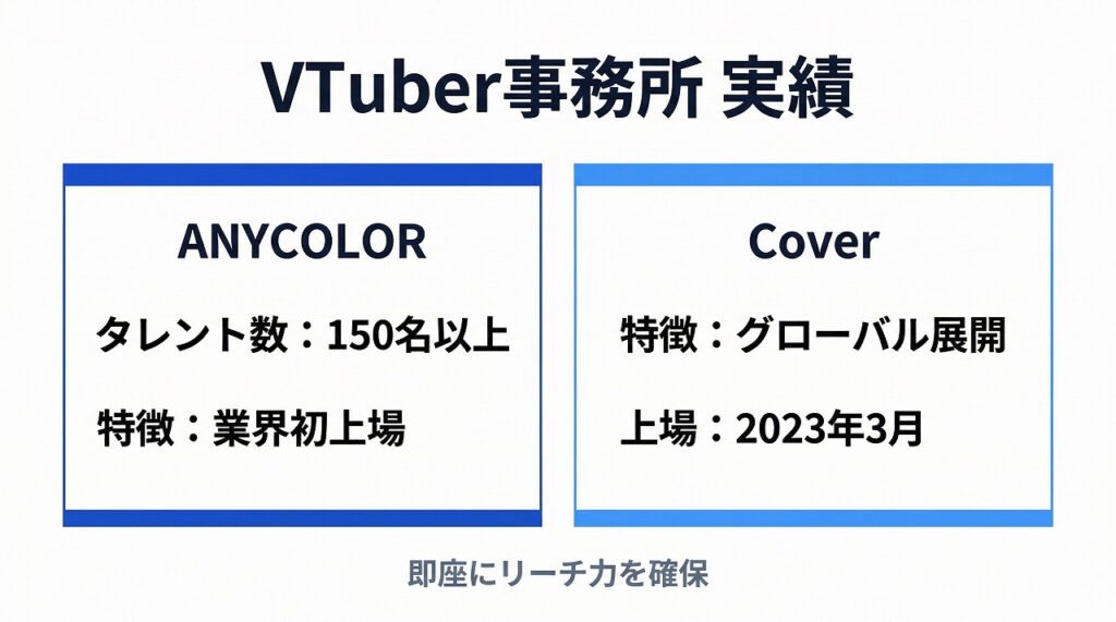 VTuber業界初の上場企業。にじさんじブランドで約150名以上のバーチャルタレントを擁する日本最大級のVTuber事務所。Live2Dモデリングとスマホ顔捕獲技術により、比較的低コストで大量のタレントを輩出。エンタメ・ゲーム領域での起用実績が豊富。