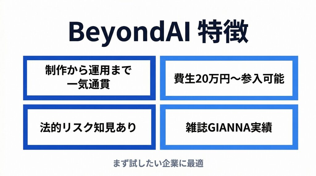 | BeyondAI | ワンストップ | 20万円〜 | ◎ | ◎ | ◎ | ◎ |