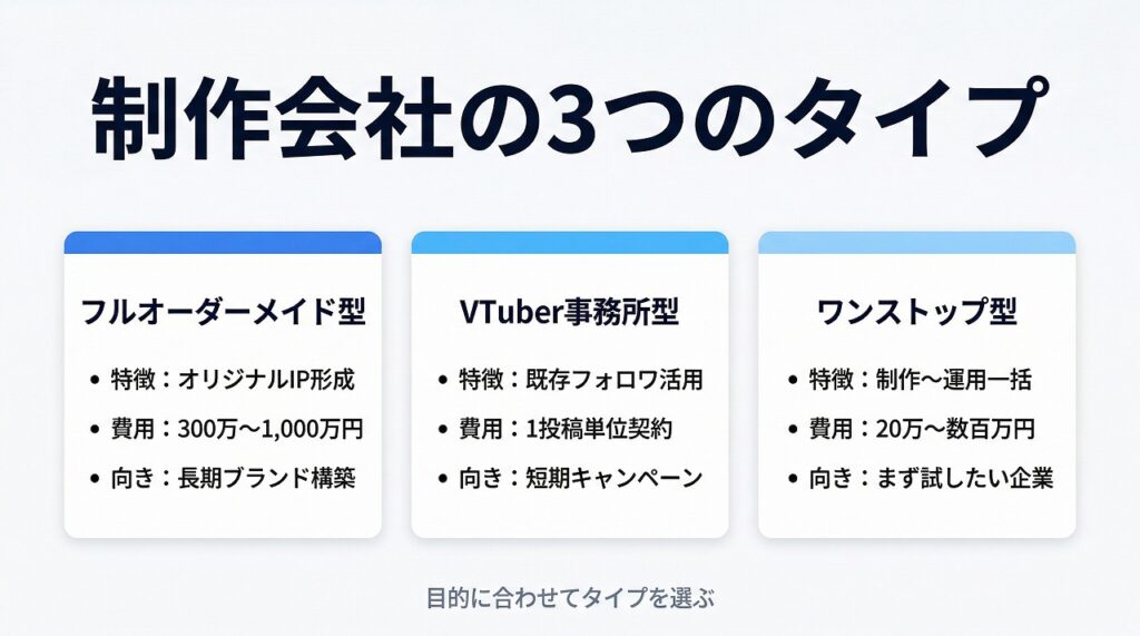 - 制作会社は3タイプ:フルオーダーメイド型(資産形成向き)、VTuber事務所型(短期リーチ向き)、ワンストップ型(バランス型)のいずれかを選ぶ