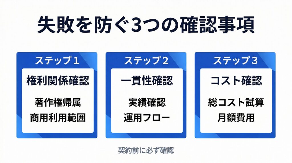 - 失敗を防ぐ3つの確認:権利関係・キャラクター一貫性・運用コストを契約前に必ず確認する