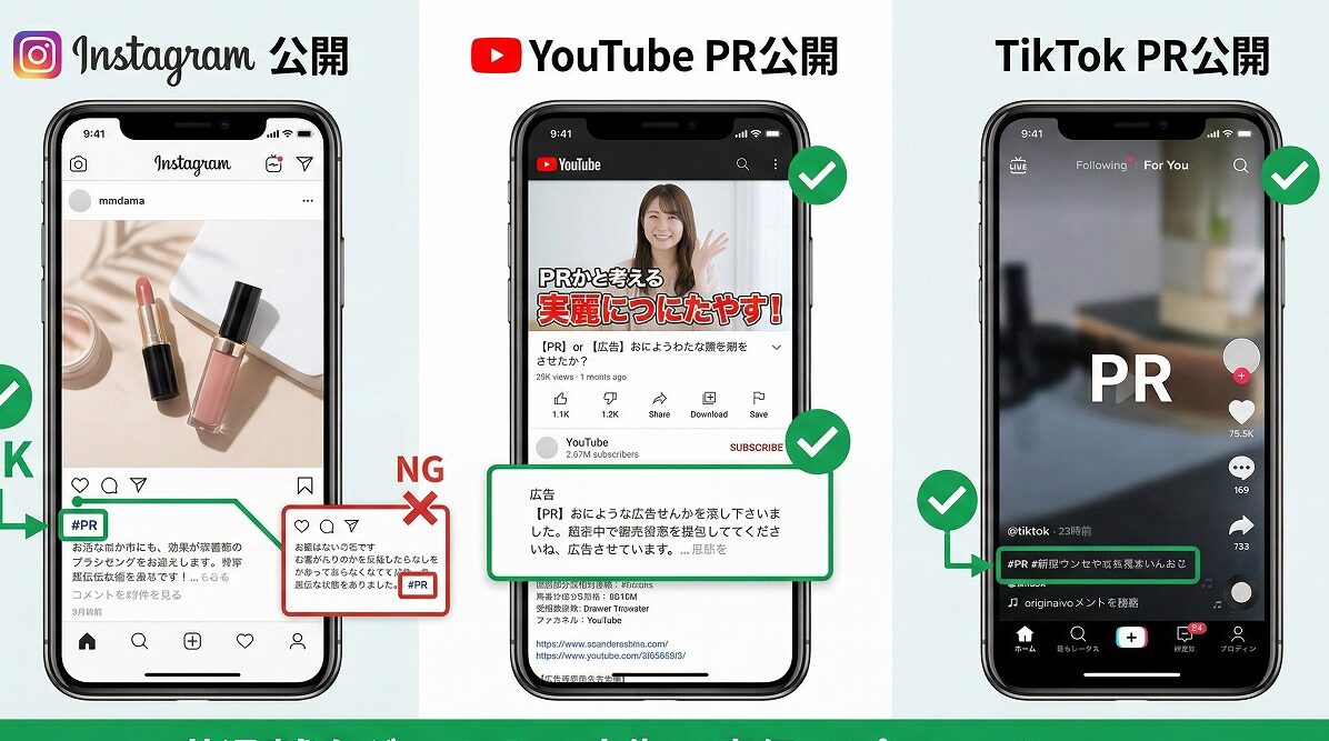 つまり、「#PR」や「広告」を明示すれば、インフルエンサーによる商品紹介は法的に問題ないということです。規制を正しく理解し、適切な開示を行うことで、企業は安心してインフルエンサーマーケティングを活用できます。