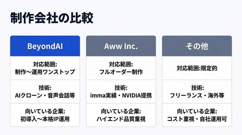 - 海外制作会社:グローバル展開を見据える場合は選択肢に入るが、コミュニケーションコストに注意