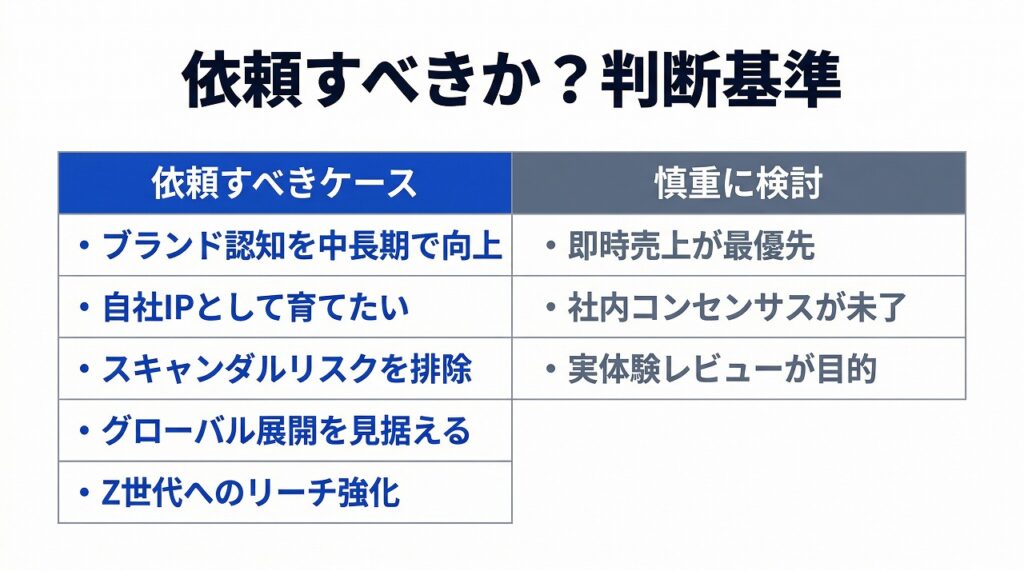 デメリットは、キャラクターが自社の資産にならないこと。契約期間が終われば関係は終了し、蓄積されたフォロワーも事務所側の資産として残ります。また、スケジュール調整や起用条件が事務所側のルールに従う必要があります。