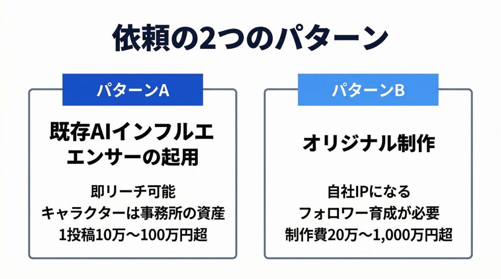 - AIインフルエンサーへの依頼には「既存タレントの起用」と「オリジナル制作」の2つのパターンがある