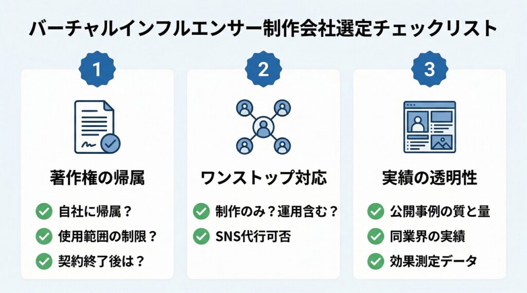 AIインフルエンサーの制作会社選びで、後悔しないための注意点を整理します。