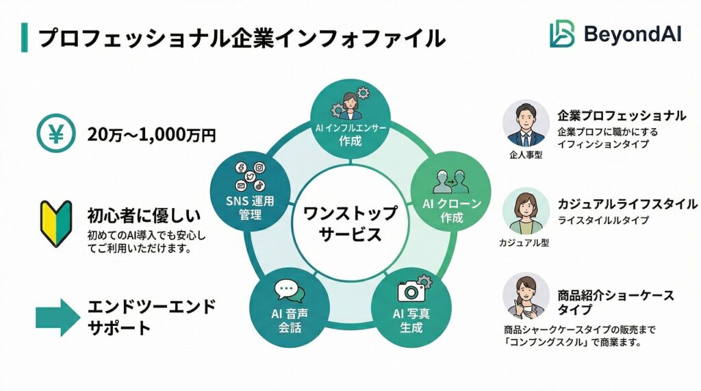 | BeyondAI | ワンストップ型 | 制作〜運用まで一気通貫 AIクローン・音声会話も対応 | 20万〜1,000万円 (プラン別) | 初めての導入〜本格運用まで |