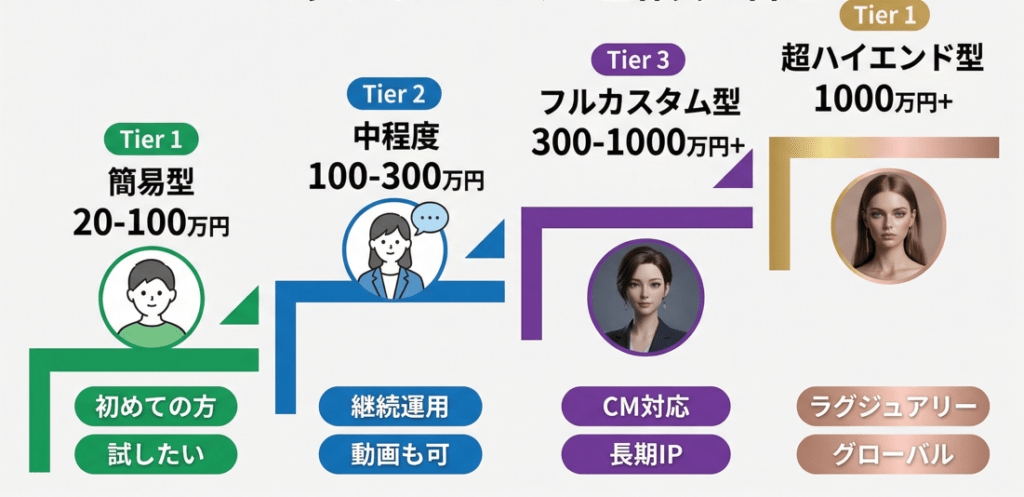 AIインフルエンサーの制作費用は、タイプ・品質・機能によって大きく変動します。ここでは費用帯別の目安と、その違いが何に起因するのかを解説します。